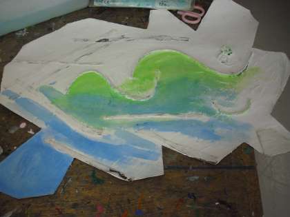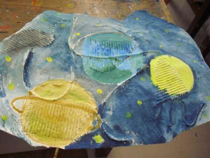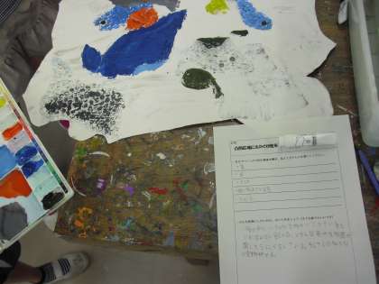 今日は、5年生の図工の作品を紹介します。題が「凸凹広場に絵の具が走る」です。初めに作った台をよく見て何に見えるかを考えて表現します。