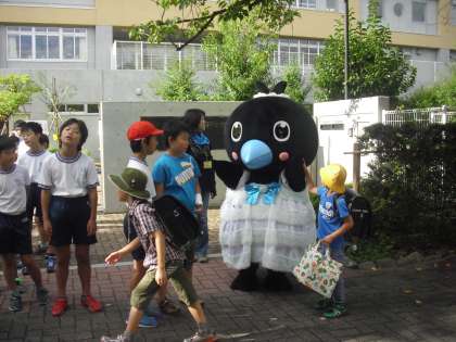 おはようございます。今日は朝から気温上昇中です。校門では烏山のキャラクター「からぴょん」も登場して、地域と学校の挨拶キャンペーンを展開しました〜