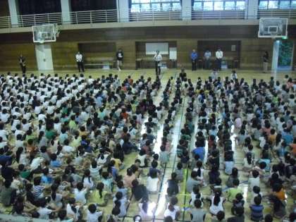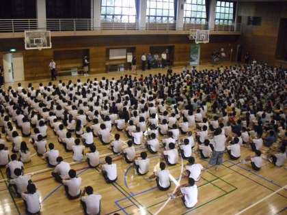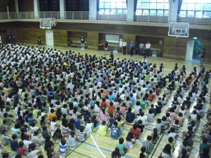 まずは体育館に小学区中学校全員集合!中学校の整列の仕方を手本とし、小学生も静かに並び話を聞きます。