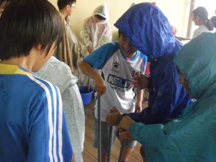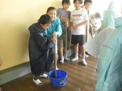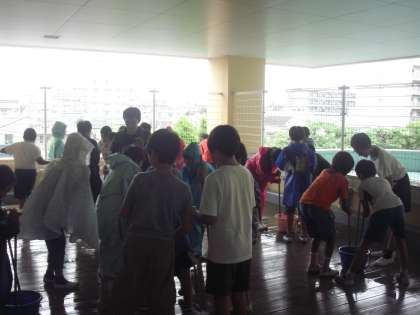 階段をのぼっていくと「ごとごと」と何やら不思議な音が聞こえてきました。バケツの水を圧で管に通し、噴水です。みんな必死に水を上げようと、「ごとごと」管を動かし、頑張っていた音でした〜。