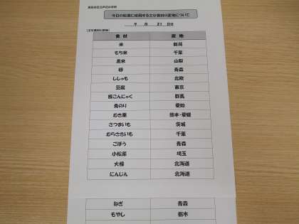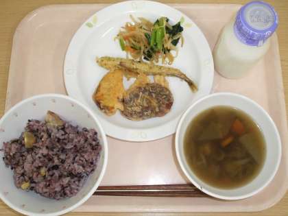 今日のご飯は、古代米の1つ“黒米”を一緒に炊き込んだご飯でした。白米に黒米を少し加えると、全体的に紫色に仕上がります。プチプチした食感も不思議な感じですね。秋の味覚、栗も入れて彩りを添えました。