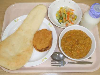 「キーマカレー」は“ひき肉”を使って作ったインド料理の1つです。たまねぎをじっくり炒めて作ったので、よく甘味が出ていました。本場のインドではライスやチャパティと一緒に食べることが多いですが、給食ではビッグなナンと一緒にいただきました。