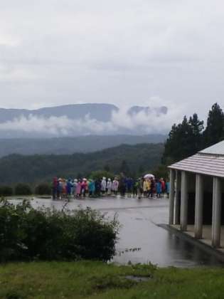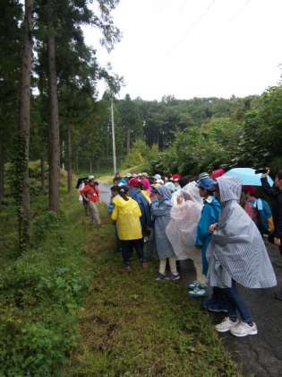 里山について、ガイドさんのお話を聞きながらの学習です。少し雨が降ってきました。カッパを着ながら歩き始めましたが、今また 止んできました。