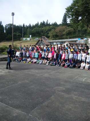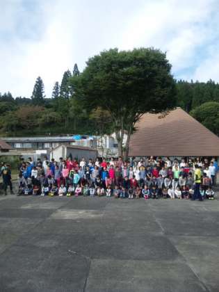 雨乞山の登山を終え、宿舎に到着しました〜。宿舎前で学年全員での記念写真を撮りました。