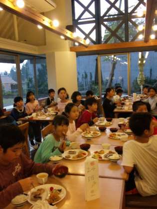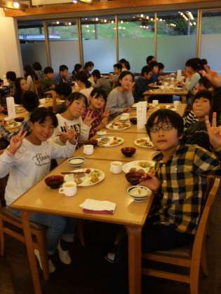 登山の後でお腹も空いた様子です。みんなでしっかり夕食をいただいています。この後はキャンプファイヤーです。