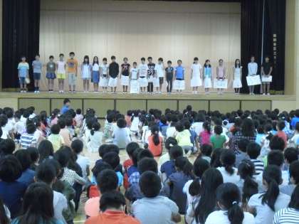 今日の児童集会は図書委員会から図書室に関するクイズです。何問正解したでしょうか・・・クイズを通して図書室のことについてまたしっかり覚えましたね〜。
