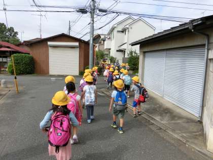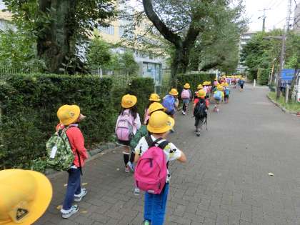 祖師谷公園まで、一年生の足で約一時間近く掛かります。なじみのある街並みから、徐々に見慣れない景色へと移り変わっていきます。途中、「あと何分ですか?」の質問を何度受けたことでしょう。しかし、誰一人ギブアップすることなく、車に気を付けながら、安全に向かうことができました。