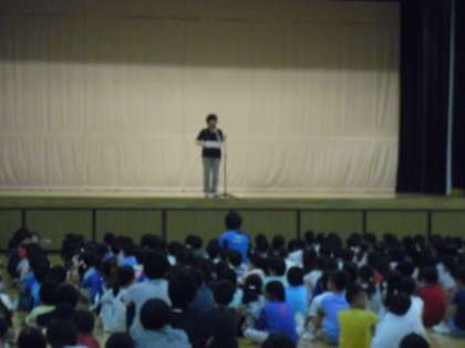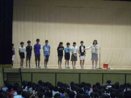 月曜日の朝です。全校朝会では、先週5年生の児童と川場移動教室に行ってきたときの話と、世田谷区民スポーツ大会で入賞した子どもたちの紹介と表彰をしました。その後、あいさつ隊の引継ぎをしました。最後に週番の先生から、今週の目標「みんなで使うもの 心をこめて大切に」の話をしました。今週もしっかり過ごしましょうね!