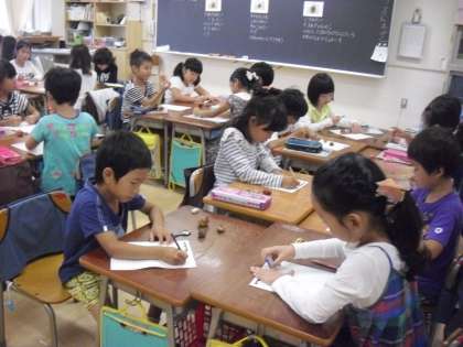 1年生の教室で球根を観察して特徴をつかみ、絵や文で表現する活動をしていました。