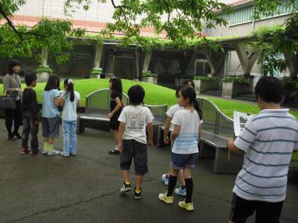 美術館に入る前に「探検・発見美術館」として庭の彫刻やベンチなど美術館のまわりを少し見てまわりました。ベンチの曲線はこの世田谷美術館のテーマになっている形だそうです。よく見るとたくさんのこの形にめぐり会いました。それは作品表示だったり、椅子だったりしました。このような知識があると美術館の違った見方ができるように思いました。