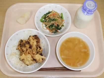 給食では「かき揚げ」も1つずつ手作りしています。今日の具材は、たまねぎ、枝豆、ちくわ、さつまいも、ごぼう、大豆でした。枝豆と大豆がポロポロこぼれ落ちないよう、衣の固さに注意して作りました。