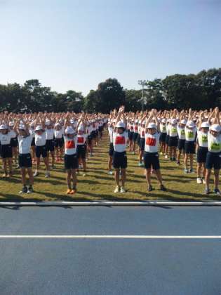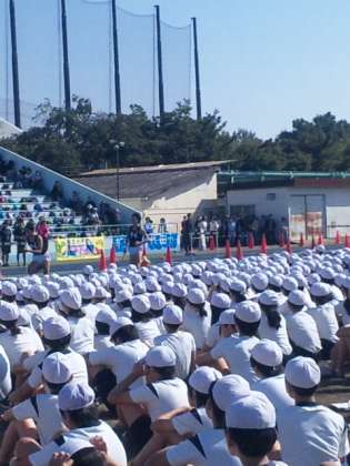 6年生の連合陸上競技大会が始まりました。準備運動をして選手のデモンストレーション演技を見せていただきました。