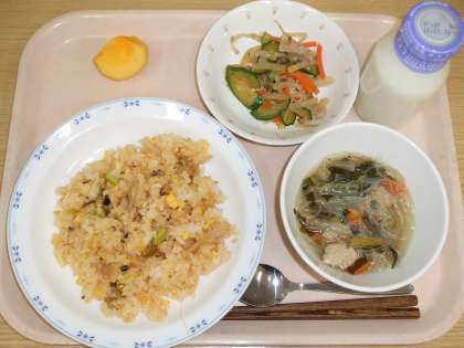 具だくさんの「春雨スープ」に、今日は“肉団子”が入っています。冬場の鍋物のような仕上がりです。“しょうが汁”を最後に加えているので、体も温まります。