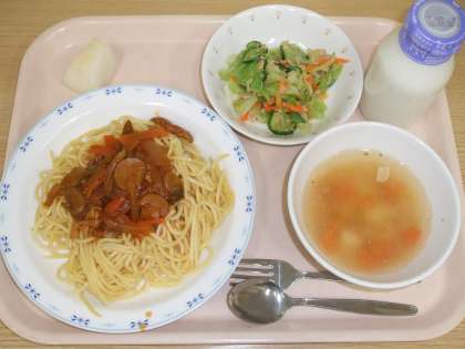 「スパゲッティナポリタン」は、日本生まれの“洋食”です。今日のソースの具材には、豚肉、たまねぎ、にんじん、ピーマン、マッシュルーム、ウィンナーを使いました。お店で出てくる「ナポリタン」は、パスタとソースが絡められていますが、給食では時間がたってもおいしく食べられるように、パスタとソースは別々に出しました。