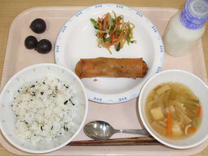 「春巻き」は中華料理の点心の1つです。最近は冷凍食品が多く出回っていますが、給食室では1本ずつ皮に包み、油で揚げています。揚げ立ての春巻きは、皮のサクサクとした食感がおいしいですね。