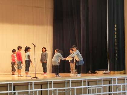 4年生から3年生へあいさつ当番が引き継がれ、元気いっぱいのPRを発表してくれた代表児童でした。全校であいさつを広げていきましょう。