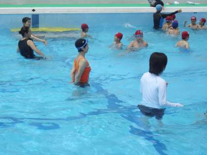また低学年では水位が低いために、子どもたちがプールサイドに上がれないために、水中に台を入れるなど工夫をしながら行っています。