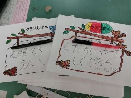 11月、ふれあい月間にあたり、全学年でクラスのよさを見つめる活動を行っています。一人ひとりが自分のクラスをどうとらえているのか、とても興味深いところです。子どもたちにとって、「居心地のよい学級」「大好きなクラス」であってほしいと思います。今後、書き上げたカードを掲示していきます。
