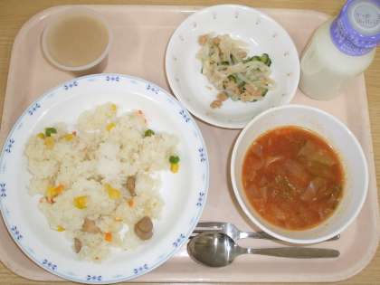 「三色ピラフ」は彩り鮮やかに、にんじん、ホールコーン、グリンピースをちりばめたピラフです。味付けは塩、こしょう、しょうゆで素朴に。料理の組み合わせをかえて、ケチャップ味にしてもおいしいです。