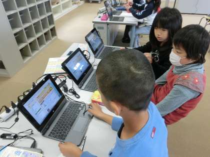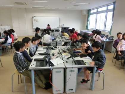 教科「日本語」の学習です。月別の行事について追究していく活動を行っている3年生。自分で学習課題を設定し(例えば「11月を調べよう」)、インターネットを活用しながら解決を図っているところです。一人が一台ずつタブレットを操作する光景が現実になるとは、40年前には想像できませんでした。子どもたちは時代の進化への適応が早いですね。