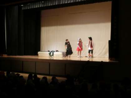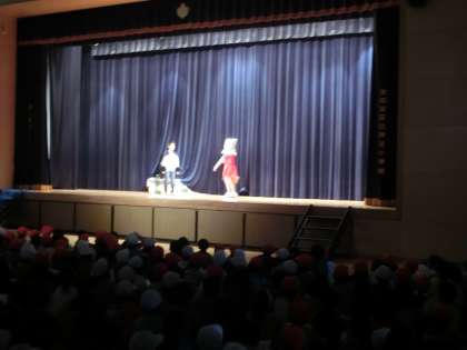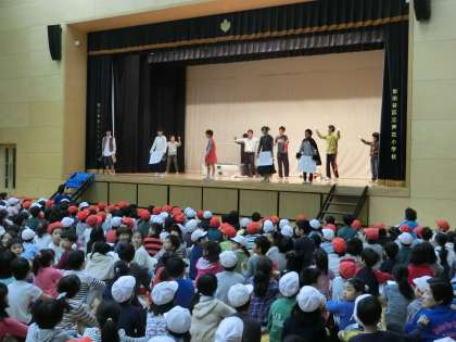 今朝は劇を鑑賞したあと、それに関するクイズが出題されました。真っ暗になった体育館でスポットライトを浴びた役者たち、プチ学芸会気分も味わえました。