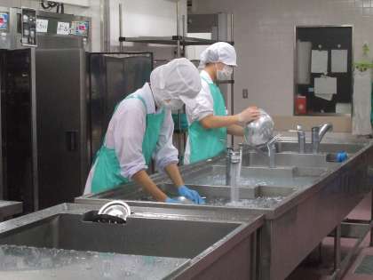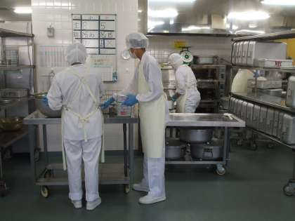 芦花中学校2年生3名が、給食室に職場体験に来ています。午前中は、ゼリー液をカップに注いだり、カレールウを作ったり、配缶、洗浄などの仕事を一緒にしています。愛情を込めて作った給食、みんなが残さず食べてくれるとよいですね。