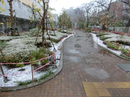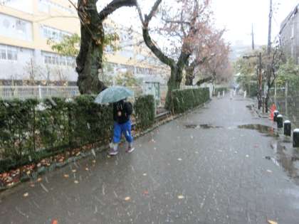 気温が0度台にまで下がり、雪が本降りになりました。地上でも積もり始める中、登校時間を迎えました。子どもたちは大はしゃぎ! 大人と違って嬉しそうな顔、雪の話題で持ちきりです。わざわざ傘を差さずに、雪を体感しながら歩いている子までいましたよ。