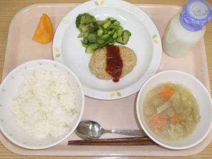 ハンバーグをおいしく作るポイントは、生地のひき肉をよく練るところにあります。今日の生地作りは、職場体験に来ている生徒たちが行いました。極寒の中、冷たいひき肉と格闘し、しっかりした生地が完成しました。