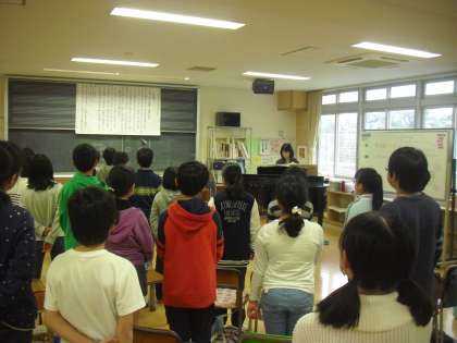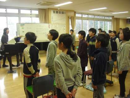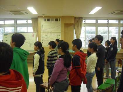 音楽室で歌唱の学習です。歌詞の意味、この歌が作られた背景について、調べたことを発表しながら、気持ちを込めて歌っていました。