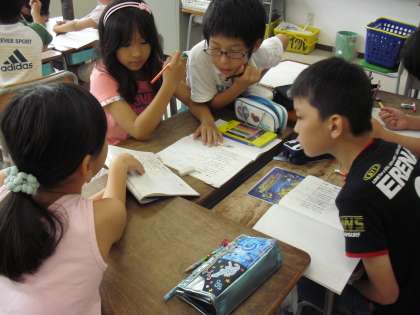 4年生の授業風景です。この授業の中には「学び合い」がたくさんあります。これが学校教育のよさです。友だちの考えを聞いて、自分と違う考えがあることに気付きます。そして自分の考えを変えたり、深めたり、新たな考えを見つけたりします。自分の頭の中にある考え方だけでは思考が深まりません。ここには知識を得るだけではない学習があります。