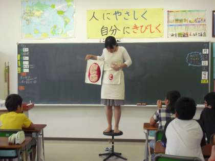 今日は6年生の保健体育の授業でした。養護教諭の鈴木先生の指導です。鈴木先生はエプロンを身につけて赤ちゃんがどのような状態でお腹の中で過ごし、そして生まれてくるのかを分かりやすく説明してくれました。