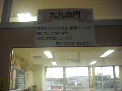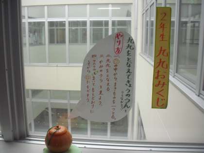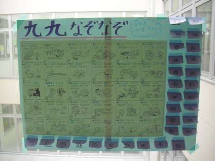 2年での教室前ではかけ算の関所!?を設け、また、かけ算をゲーム感覚で覚えられるように、あの手この手で練習できるように仕掛けています。
