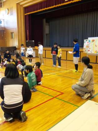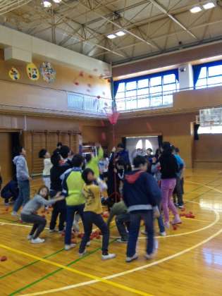 芦花小のみんなの説明で、妖怪体操を踊りながらの玉入れゲームをしました。低学年チームの勝利!!