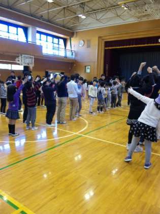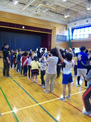 他校の友達と混ざって4つのチームをつくり、ボールリレーです。うまくボールを送ることができましたか・・