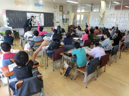 2年生、道徳の時間です。学習資料のイラストに描かれた具体的な様子をよーく見て、街中のNGシーンを探しています。あちこちに、困ったさんを発見し、たくさん手が挙がっていました。それに気付けた2年生だから、きっと自分自身の生活でも反面教師として生かしてくれると信じていますよ。