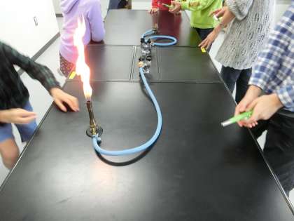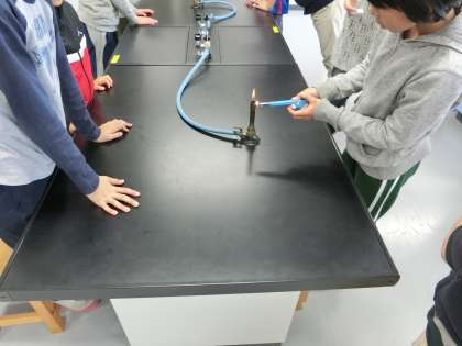 科学クラブでは、ガスバーナーの使い方を練習しています。火を扱う活動ゆえ、かなり念入りに事前の安全指導を行った上で、いよいよ実物を使っての点火に挑戦のときを迎えました。本日は、マッチではなく、チャッカマンが登場です。ハラハラドキドキの操作、いきなり大きな炎が立ちあがり、おっかなびっくりの顔も。しかし、どのグループも無事に点火式を修了できましたね。ホッ。