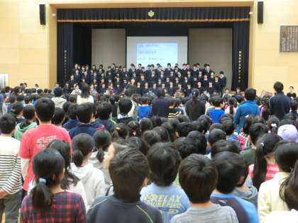 いつもなら芦花小学校の児童だけで行う音楽朝会に、今朝は芦花中学校の3年生が仲間入りしてスケールアップ。いえ、グレードアップした朝会となりました。