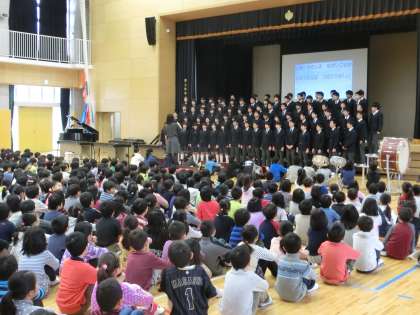 お馴染みの歌い慣れた曲「つばさをください」も、中学生が歌うとガラッとイメージチェンジ!! その違いに小学生は驚いたり、聞き惚れたり。