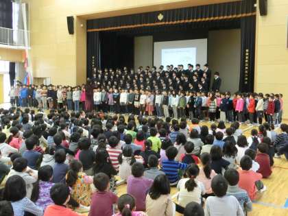 1校時がまるまる音楽という長い朝会でしたが、子どもたちは集中力を切らすことなく、参加することができました。施設一体型の利点を生かした、充実したひとときとなりましたね。