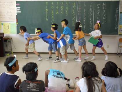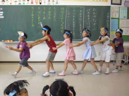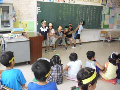 1年生の国語の授業です。学習してきた「おおきなかぶ」のまとめとして、グループ毎に劇遊びを行いました。一人一人が役になりきって台詞や動きで表現します。このお話はなんといってもおおきなかぶを、みんなで協力して「うんとこしょ。どっこいしょ。」と引きぬこうとするところが見せ場です。手作りのお面をかぶり楽しそうに演じました。