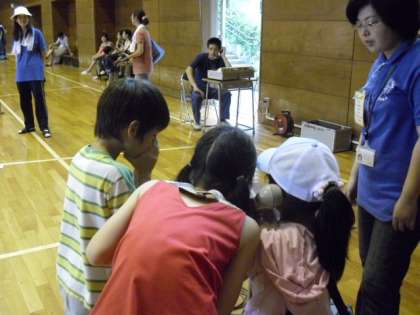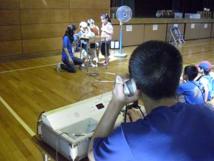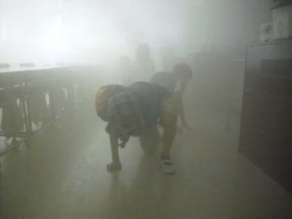 通報体験コーナーでは、火災や事故発生時の通報体験をしました。消防署の方と電話を通じてやりとりをします。何が起こり、どんな状況で、場所はどこなのか、端的に伝えていきます。校舎では、煙の中を避難する煙中避難体験コーナーがありました。ハンカチで口と鼻をふさぎながらしゃがんで煙の中を進んでいきます。避難路を確認するのが難しかったようです。