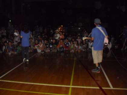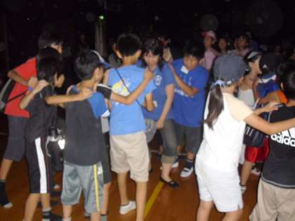 夕食の後は、体育館でキャンプファイヤーです。芦花小学校の子どもたちのためにやってきた、火の神様と3人の火の子が点火。キャンプファイヤーの始まりです。歌やゲームで楽しみました。キャンプファイヤー後は肝だめし。真っ暗な校舎を友達といっしょにまわりました。多くの方々のご協力により、今年のOYAキャンも子どもたちのよい思い出になりました。ありがとうございました。