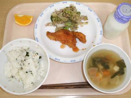 今日の「魚のフライ」には、「ホキ」を使いました。家庭ではあまり使わない種類かもしれませんが、クセのない白身の魚なので、魚が苦手な子でもフライにすると食べやすくなります。