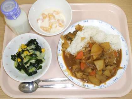 今日の給食は、1月22日の「カレーライスの日」に合わせて、「ポークカレーライス」をいただきました。屋外は雪がちらつき寒さが増してきましたが、香辛料をきかせたカレーライスを食べて、体が芯から温まりました。