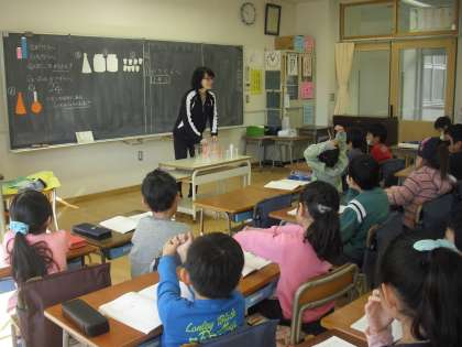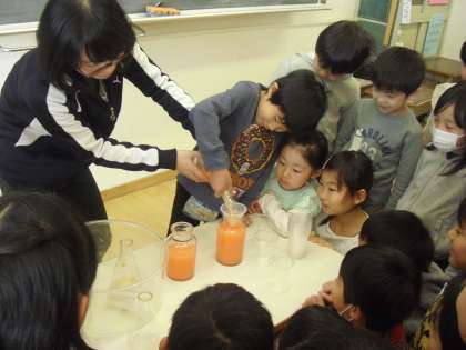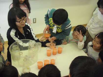 見ただけではわからないジュースの量をどうやって比べたらよいか、班でアイディアを出し合い、出された方法で比べてみました。