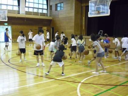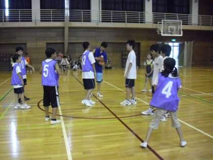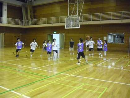 活動三日目は、まず、準備運動代わりにドリブルを使ったゲームを行いました。その後に、中学生と小学生が混在するチーム分けをして、5分間のミニゲームをして楽しみました。小学生が活躍できるように、チャンスに小学生にパスを出す中学生。それでも流れるような中学生のプレーは小学生にとってあこがれです。