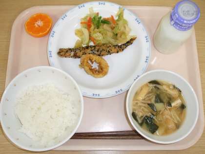 今日の揚げ物は二色揚げ!1つはカレー風味の「いかリング」、もう1つは衣に黒ごまを混ぜた「ししゃものごま揚げ」でした。噛みごたえのある食材で、よくあごを動かしながら食べていました。