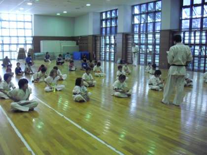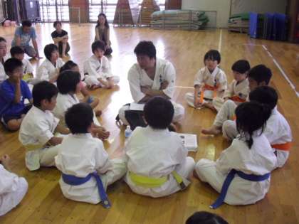 まずは、教える側の子どもたちが予定を確認します。校長も参加しました。運動に入る前に、空手の歴史について簡単に学びました。