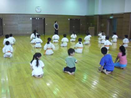 日曜日の午前10時から、格技室でサマーワークショップ「親子で空手をやってみよう!」を行いました。空手教室に所属している子どもたちが、今回参加した子どもたちや保護者の方に基本の動作を教えます。