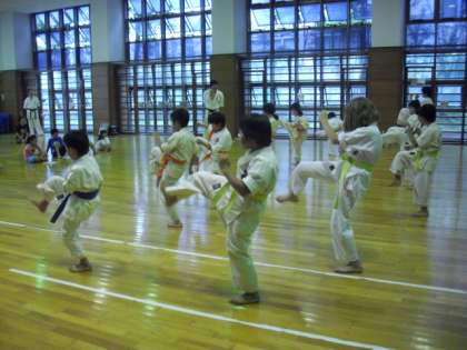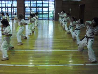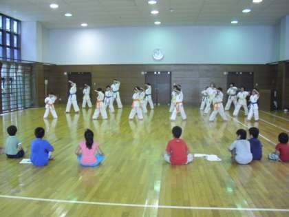 空手の基本の動作を体験する前に、空手教室の子どもたちによるモハン演技を模範演武がありました。子どもたちや保護者の方を前に、気持ちを引きしめて気合いを入れます。「エイッ!」「エイッ!」この模範演武が今回の体験する基本の動作となりました。